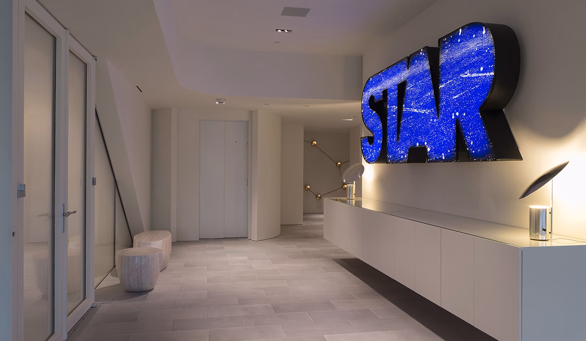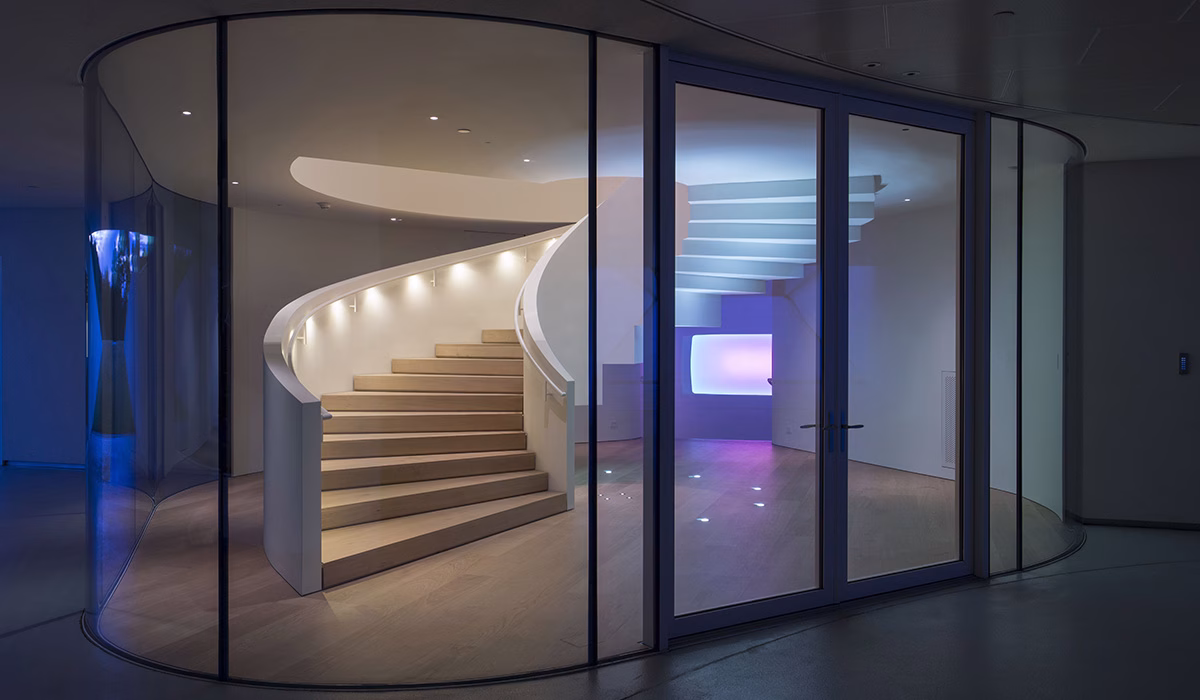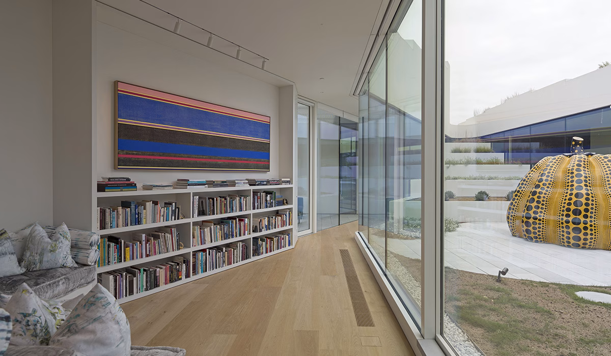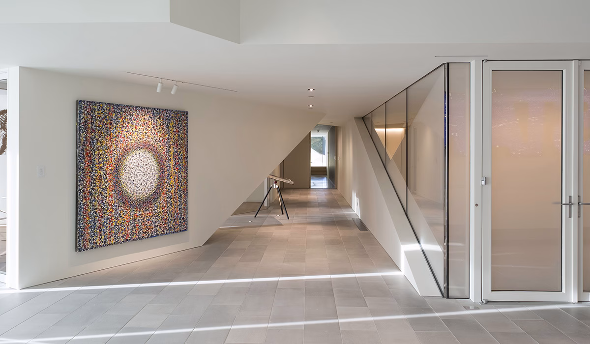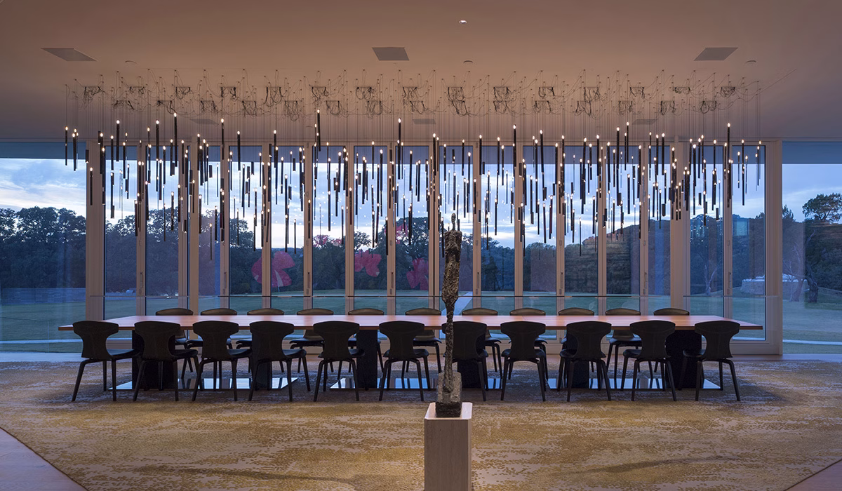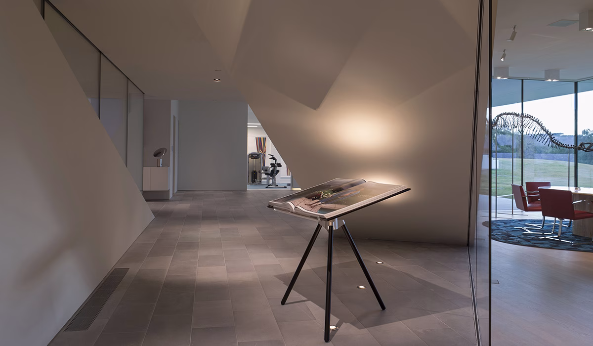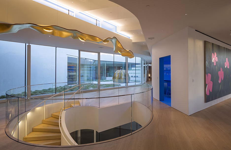 The finishes and appointments are museum quality; climate control systems were designed to meet standards established for the Museum of Contemporary Art in Los Angeles. Spectacular landscaping includes a water feature requiring conversion of a wet weather creek into a constant level pond with water pumped upstream to create a constant flow of water in the stream, with waterfalls along the way. The structures employ concrete and steel structure with light gauge metal wall framing, stucco and polished stainless steel exterior finishes. Large expanses of frameless glass encompass most of the exterior. MEP system was integrated into a slim profile structure with limited above ceiling space. BIM was utilized extensively to ensure successful construction.