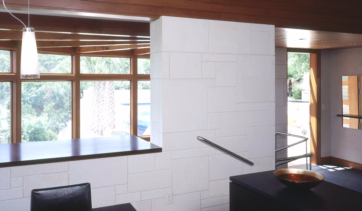 A glass curtain wall, carefully milled woodwork, and limestone masonry converge to underscore the home’s natural surroundings.