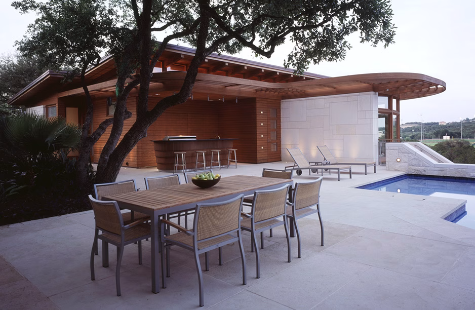 Perched on limestone hills overlooking Austin and utilizing raw materials informed by its environment, this exquisite home brings light, air, and a panoramic view into the space to blend nature, form, and function perfectly.
